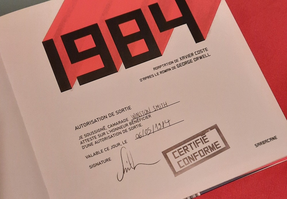 Ce genre d’anecdote me fait évidemment penser à l’actualité, quand par exemple on censure la culture parce qu’un chef d’état a déclaré qu’elle n’était « pas essentielle« . Xavier Coste ne manque pas de faire des ponts entre ce 1984 de fiction et notre 2021 bien réel. J’ai particulièrement aimé la toute première image sur la page de titre : un formulaire d’autorisation de sortie.