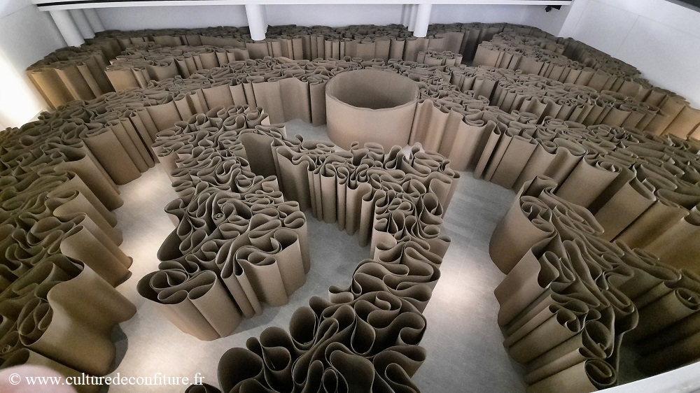 Actuellement, le musée accueille deux expositions temporaires. L’une est consacrée à l’histoire du papier et nous fait voyager 2000 ans en arrière, de l’Asie ancienne à l’Europe en passant par l’Arabie contemporaine. Parmi les œuvres exposées, l’une des plus célèbres estampes d’Hokusai connue sous le nom de Grande Vague de Kanagawa. Plus étonnant et ludique, le labyrinthe en carton de l’italien Michelangelo Pistoletto (qui ne m’a pas réconcilié avec l’art contemporain).