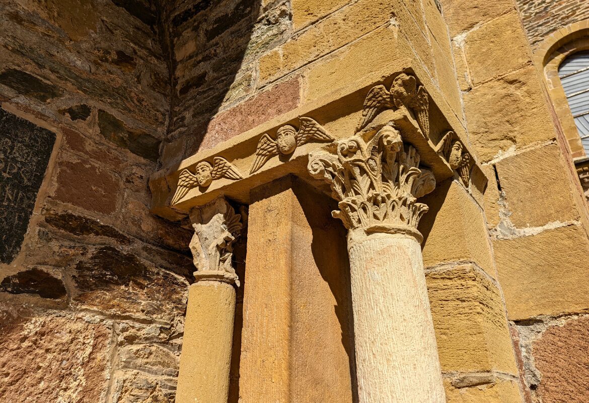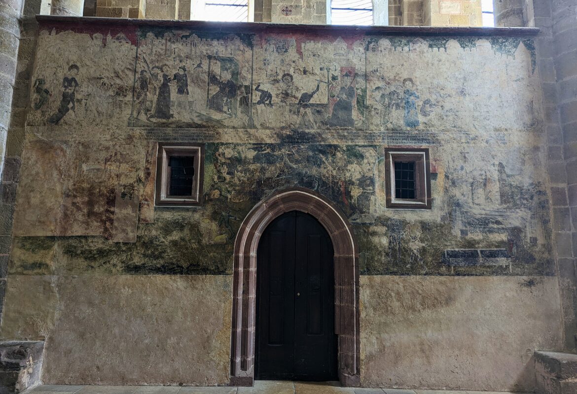Bien entendu, le spectacle continue une fois passés les portes de l’abbatiale Sainte-Foy ! On est, comme souvent je trouve dans l’intérieur des architectures romanes, sur une atmosphère plutôt sobre. J’ai particulièrement aimé voir au niveau de la sacristie les fresques du XVème siècle racontant le martyr de sainte Foy. Et ais-je besoin de mentionner la beauté des chapiteaux romans, une autre de mes grandes passions ? On en trouve d’ailleurs également de superbes représentations au niveau des vestiges du cloître.