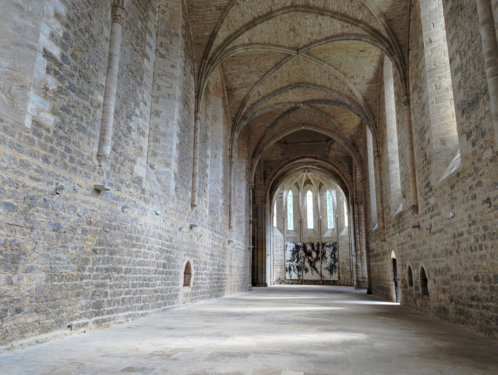 Et il y a de quoi voir ! L’église, bien entendu, est exceptionnelle, avec sa longue nef à vaisseau unique et ses ouvertures en lancettes. Le chœur s’orne d’un triptyque monumental commandé à l’artiste Serpan en 1972 à l’occasion de l’ouverture du centre d’art. Une petite salle capitulaire est attenante. Le dortoir des XVIIème et XVIIIème siècle constitue l’essentiel du bâtiment, qui abrite aujourd’hui la collection d’art contemporain. Le cellier est lui toujours en cours de restauration. Le domaine est également entouré d’un très vaste parc, avec un jardin aux mille rosiers plantés selon les principes du jardinier André Eve.