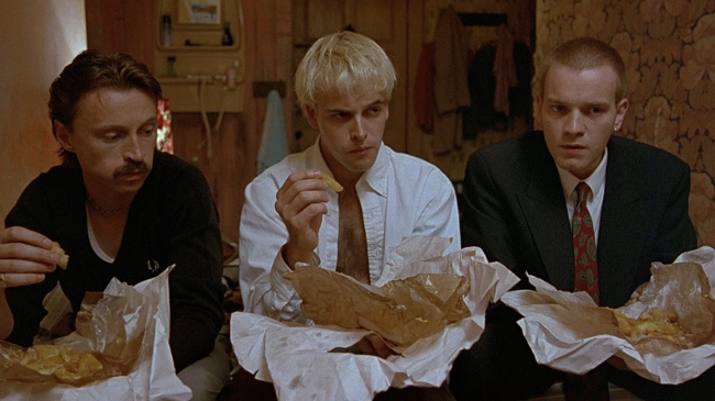 Et bien entendu, ce qui fait Trainspotting, c’est la performance de ses acteurs. Tous. Forcément, Ewan McGregor est au sommet de son art. Oui je sais, c’était le tout début de sa carrière. Mais honnêtement, a-t-il déjà été plus convaincant que dans ses films avec Danny Boyle ? Sa dégaine. Sa manière de bouger dans son tee-shirt trop petit. Son aisance à se glisser dans les scènes malaisantes de shoot et de sevrage. Et tous les autres ! Bien entendu on pense à Robert Carlyle, le flippant Francis Begbie qui mène sa bande de mecs paumés à la baguette. Ewen Bremner, inoubliable dans le rôle du gentil idiot Spud. Et mon coup de cœur : Jonny Lee Miller dans le rôle du perturbé Sick boy. Impeccables, absolument impeccables. Trainspotting est un film qui laisse le champ libre à des interprètes de talent pour s’emparer du récit et le transcender.