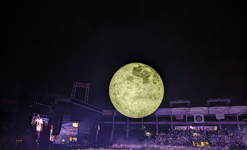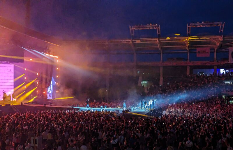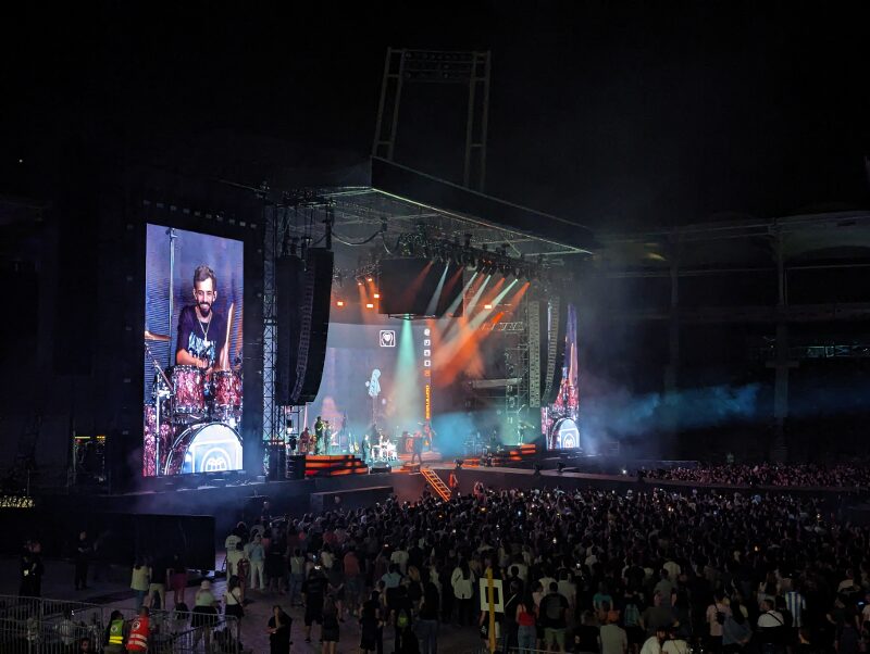 Les frères ont mis le paquet autour de la scénographie de ce stade. Des flammes, un avion qui survole le stade, un spectacle lumineux de drônes, un feu d’artifice final (encore plus impressionnant que celui de Taylor Swift, je tiens à le dire 😉 ). Bon, pour les drônes, nous avons moins bien vu le rendu que ceux qui étaient en face de la scène, mais c’était impressionnant, ultra travaillé. Mais ma préférence va à la grande lune qui a traversé le stade au moment de Sur la lune. Une mise en scène très poétique pour une chanson que j’adore, avec les bracelets illuminés en bleu… C’était juste superbe. Et pour le fun, Oli sur un bateau gonflable au milieu de la foule au final. Comme un délire entre potes. On est tous entre potes !