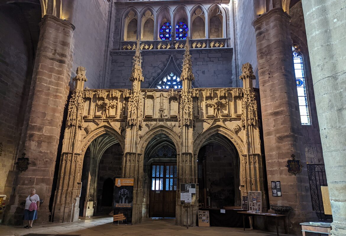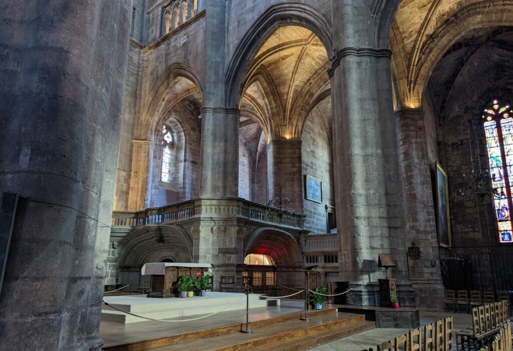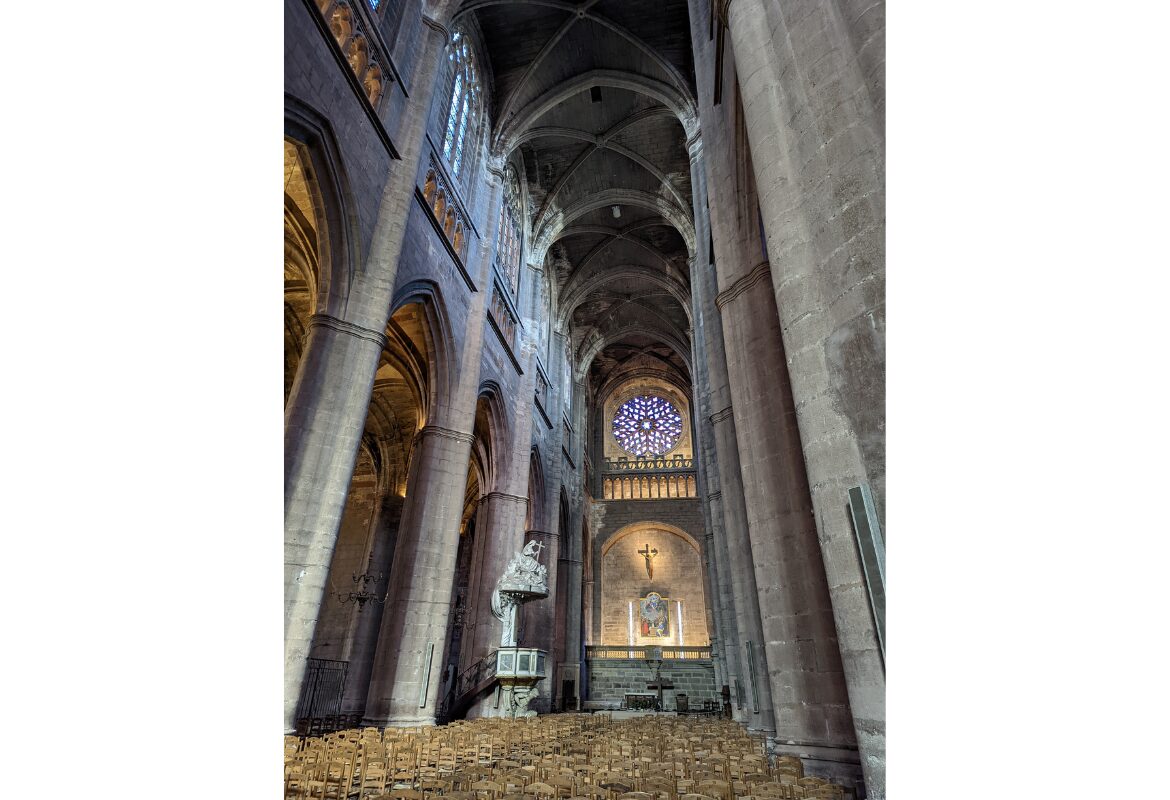 Toute l’identité de la cathédrale repose sur sa pierre, ce fameux grès rose extrait des carrières locales. Son grain un peu rude renforce l’aspect défensif à l’extérieur mais apporte une chaleur incroyable à l’intérieur. Le plan de l’église est en croix latine, avec un chœur à déambulatoire et des chapelles rayonnantes. Une fois à l’intérieur, vraie ambiance gothique : pas si souvent qu’on voit cet effet dans le sud ! Les voûtes s’élancent haut avec élégance. En levant les yeux dans le chœur, on peut admirer la monumentale clef de voûte de Bertrand de Chalençon, l’évêque qui relança les travaux au XVème siècle.