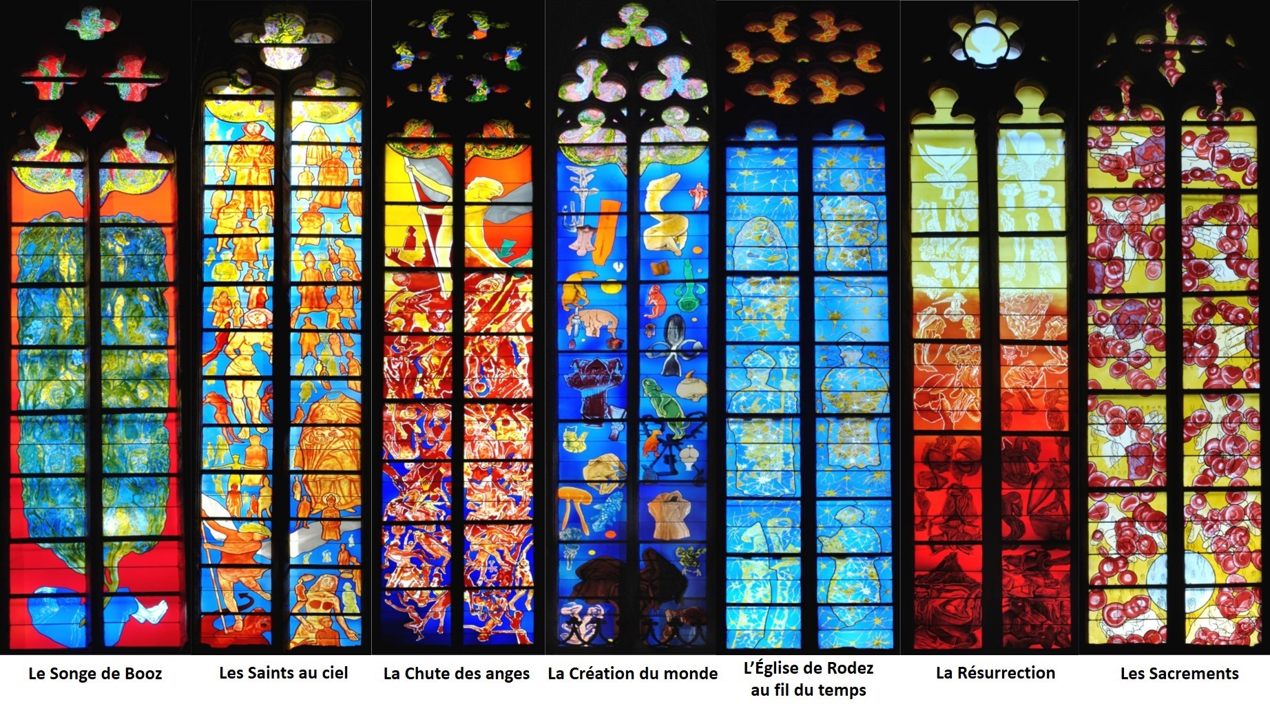 Les vitraux de la cathédrale de Rodez méritent qu’on s’y attarde longuement, car ils sont uniques en leur genre. Si les fenêtres hautes du chœur conservent des fragments médiévaux précieux du XVème siècle, c’est la série contemporaine de Stéphane Belzère, installée dans les années 2000, qui crée un véritable électrochoc visuel. L’artiste a brisé les codes de l’iconographie religieuse traditionnelle pour explorer le thème du vivant, avec notamment des représentations des 4 éléments.