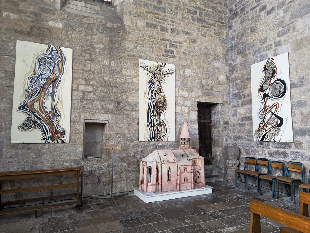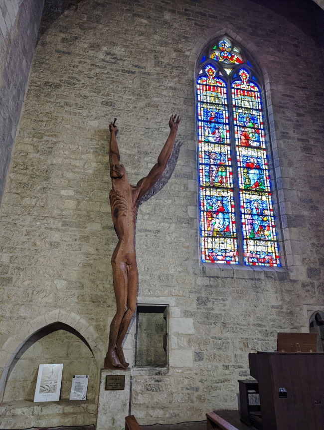 On ne s’attendait pas à trouver à l’intérieur un ensemble de vitraux admirables, “le plus bel ensemble de vitraux anciens du Tarn-et-Garonne” nous promet une affichette ! Le vitrail central a été réalisé au XIVème siècle. 32 médaillons illustrant la vie qui Christ sont présentés, rien que ça ! Autre élément marquant, un impressionnant Christ en bois d’ormeau du sculpteur Zadkine, réalisé en 1954. Une œuvre totalement surprenante par sa réinterprétation de l’iconographie traditionnelle, avec une croix qui ne fait que se deviner. J’ai aussi aimé découvrir des œuvres de Pôl-Roux, un peintre de la région. Ce petit reportage rend bien mieux justice à ses tableaux que mes photos.
