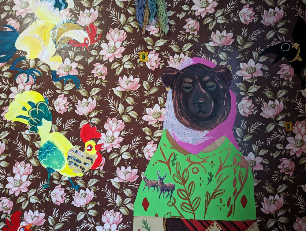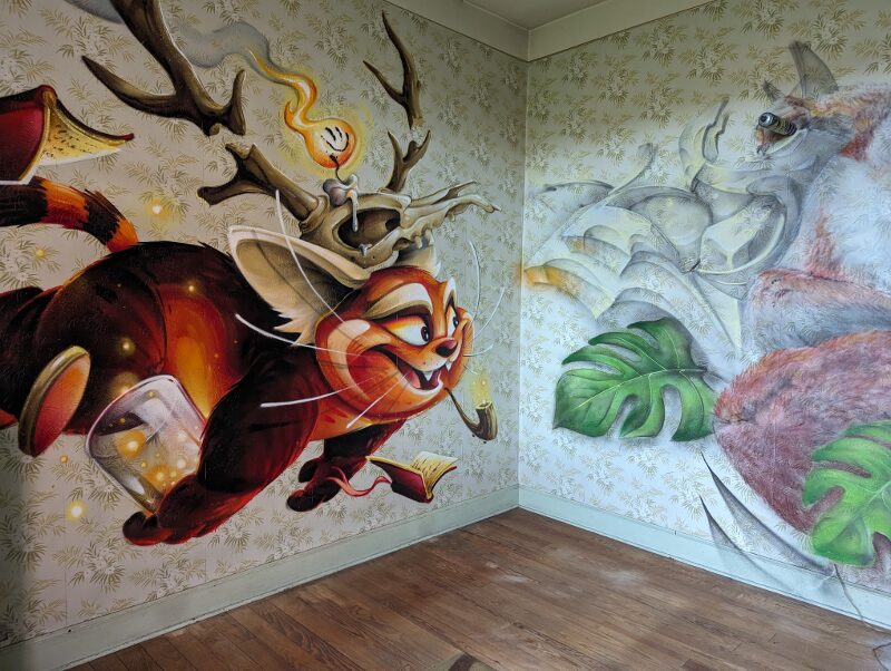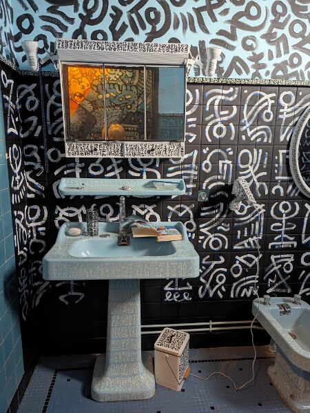 Rien qu’à la vue de la façade ultra colorée, j’ai été séduite. Je ne m’attendais pas à ça ! Chez Babayaga donc. Un écho à ce personnage mythique du folklore slave, énigmatique et multi-facettes. On retrouve donc dans toutes les pièces des références à une sorte de tiraillement entre force positive et inquiétante. Et aussi beaucoup d’animaux qui peuplent l’imaginaire de Babayaga. C’est aussi fou d’imaginer que tout cela a été fait sans financement, les artistes ont en partie financé leurs œuvres. Des partenariats ont été noués, comme avec Emmaüs Toulouse qui a fourni des meubles que j’aurais juré être d’origine dans la maison !