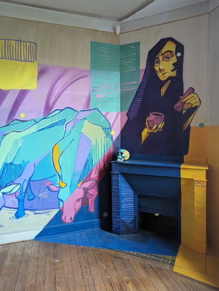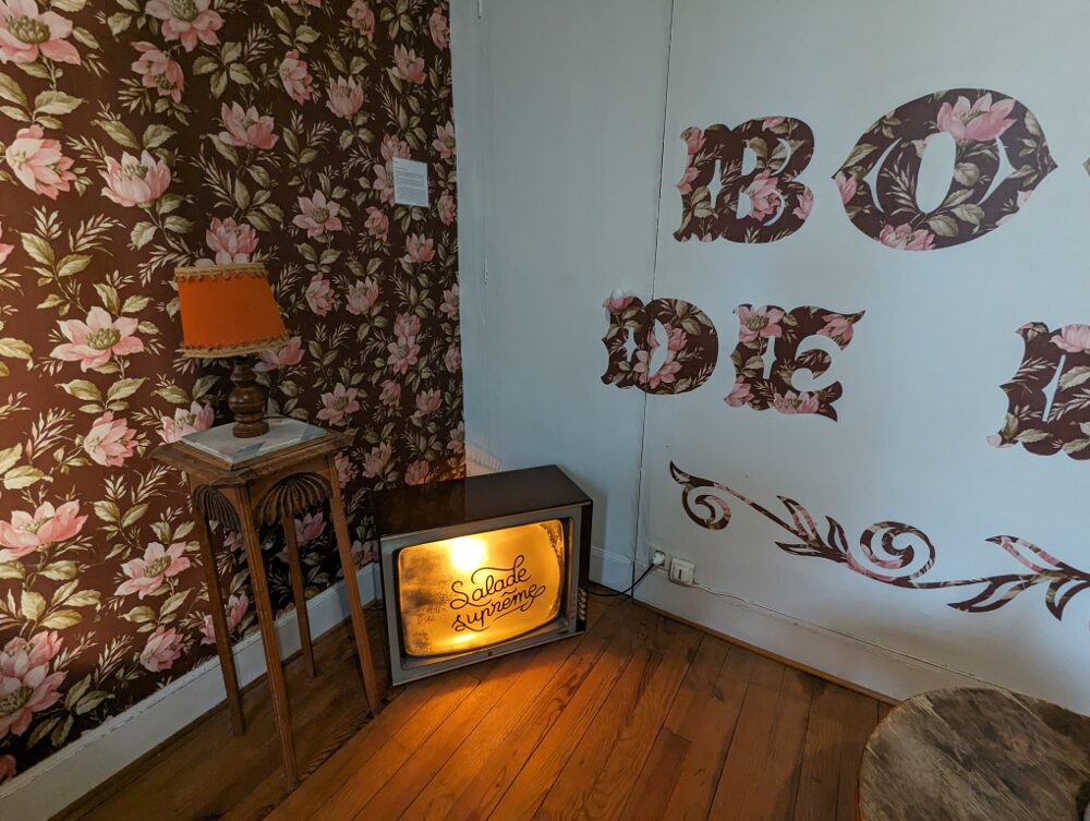 En quelques mois, ce n’est pas moins d’une quarantaine d’artistes qui ont répondu à l’appel du collectif Salade suprême, et à sa démarche culturelle, sociale et écologique. Romain Perrin, Paked, Ben Brito, Sans prétention, Poivron farci… Ils ont tous travaillé à transformer les 340m2 de la maison. 17 pièces sur 3 étages transformés en une sorte de cabinet de curiosités unique. Avec des univers très différents dans chaque espace. Le petit plus, c’est la guinguette installée dans le jardin.