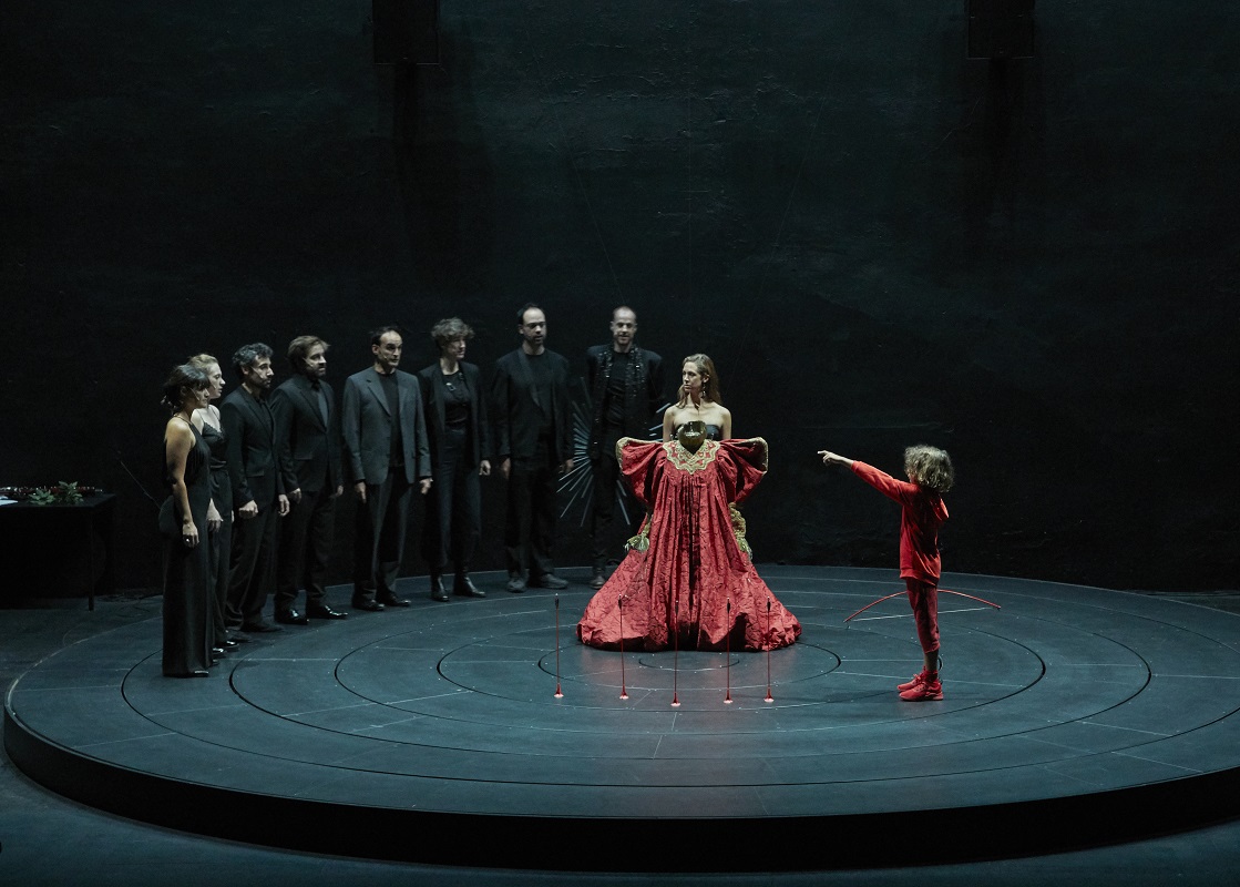 La scène imaginée par le metteur en scène et scénographe Aurélien Bory est une cible. L’effet que produit cette piste circulaire est purement hypnotique. Quand elle entre en mouvement, elle fait tournoyer les chanteurs immobiles, comme un étrange ballet de statues. C’est là que se meut le monstrueux Python avant qu’Apollon ne l’abatte avec son arc (des centaines de flèches pleuvent alors des cintres). Ici aussi apparaît le dieu-enfant Cupidon, et ses dards rouge passion. C’est également sur cette cible que les flèches brisées du dieu-soleil deviennent les rayons de sa couronne. Bref, Aurélien Bory maîtrise parfaitement l’art des métamorphoses en faisant évoluer la scène et le décor à vue pour mieux nous en faire apprécier la magie.