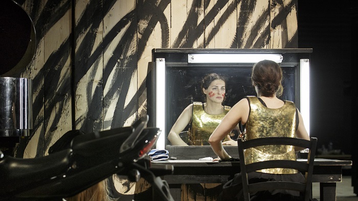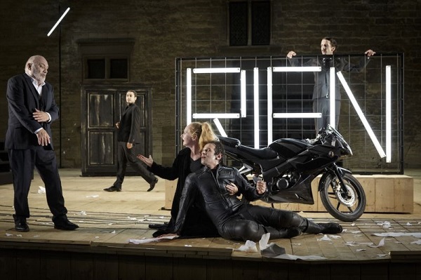 Les choix d’Olivier Py pour donner vie à cette tragédie ont été radicaux : moto noire, séances sado-maso, tuerie, amoncellement de cadavres, nudité, mitraillettes… Le mutisme de Cordélia est manifeste : un gros scotch noir est collé sur sa bouche (ses répliques sont prises en charge par un fou qui parle pour elle) et en lettres de néon géantes s’inscrivent ces mots au-dessus du plateau : « TON SILENCE EST UNE MACHINE DE GUERRE ». Incarnée par une magnifique danseuse classique, Cordélia n’existe plus que par la grâce de ses mouvements incompris.
