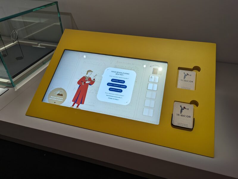 Il y a plusieurs sonores, interactifs et numériques qui viennent apporter un vrai plus à cette double expo Cathares. Je pense notamment à la borne où le troubador Peire Cardenal nous accompagne pour composer notre propre chronique. Avec notre propre nom de troubadour en plus ! Ok, j’ai eu un petit peu de mal à comprendre comment fonctionnait le bidule, j’avoue… Mais une fois que j’avais ma petite carte avec moi, j’ai pu aller au bout de l’expérience et c’est quand même assez amusant.