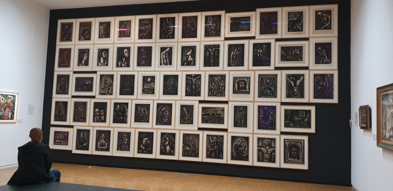 Et pourtant. Quelle claque je me suis prise en entrant dans cette salle. Si je connaissais un tout petit peu Georges Rouault et son œuvre, je ne m’attendais pas à une telle force, à une telle fougue, un tel désespoir. Le mur de présentation des gravures de son portfolio Miserere m’a sidéré. Je suis restée de longues minutes à le regarder. Georges Rouault a commencé cette épopée en 1912, à la mort de son père. Il mêle figures bibliques et motifs profanes pour rendre l’atmosphère glauque et tragique de la Grande Guerre. Le monde terrestre souffre autant que le Christ, voilà son message. La force de ses tableaux colorés tout autour est en contraste total avec cet accrochage massif en noir et blanc. Puissant.