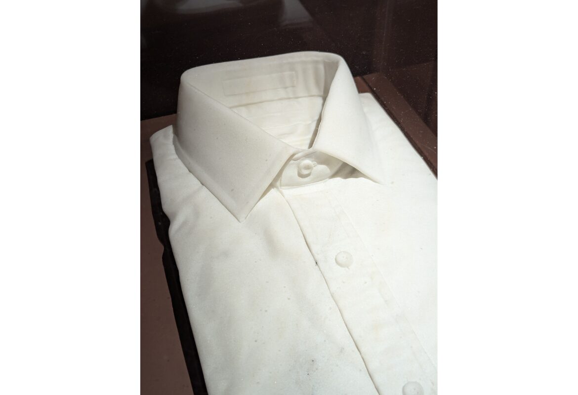 Si je devais ne vous parler que de quelques œuvres… Difficile de choisir ! Les trompe-l’oeil plus “classiques” qui ouvrent l’exposition « Le trompe-l’œil de 1520 à nos jours » qui mettent en avant des pêles-mêles retenus par des rubans ou autres m’ont beaucoup plu. Le Trompe-l’oeil aux instruments du peintre et aux gravures de Cristoforo Munari s’affranchit même du cadre. J’ai également rédecouvert avec plaisir le travail de la grisaille, qui consiste à se rapprocher de la sculpture avec une peinture en camaïeu de gris. Un procédé incroyable ! Mais ma préférence est allée à l’étonnante sculpture en marbre de Jud Nelson, qui représente… une chemise !