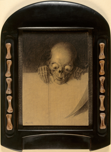 La mort et le fossoyeur de Carlos Schwabe est aussi un des tableaux forts de l’exposition. Notamment par l’utilisation de ce vert si particulier dans la main de la Mort, je n’ai pas souvenir d’avoir déjà vu un tel éclat. Un peu étonnant cependant de se dire que c’est cette œuvre qui a été retenue pour l’affiche : on est un peu éloigné de l’angoisse des premières œuvres présentées. J’ai quand même souri devant toutes les représentations de squelettes, c’est un peu ma passion tout ça. Le crâne aux yeux exorbités de Julien-Adolphe Duvocelle m’a semblé bien sympathique 😉