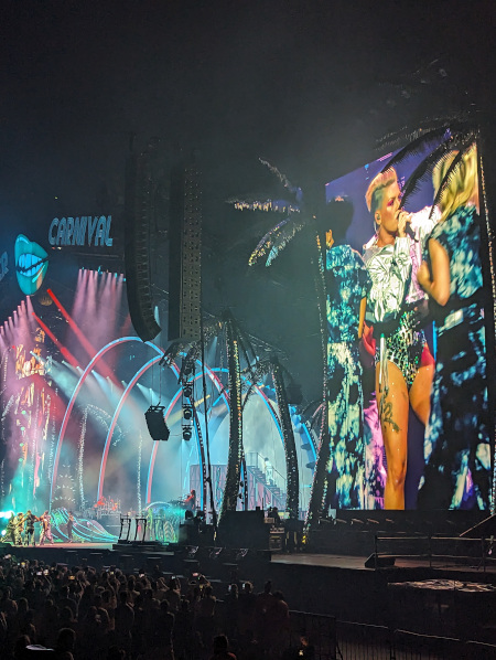 Est-ce que Pink a envoyé du lourd pour ce Summer Carnival ? Ô oui ! Le décor était incroyable, tout en palmiers-boules à facettes et arcs colorés. Ajoutez à ça des trampolines, des lancers de confettis, du feu, des costumes de bouches géantes, des bodys à paillettes… Je n’avais jamais vu un tel spectacle, ça c’est sûr ! Et Pink dans tout ça ? Ecoutez, elle est arrivée en sautant à l’élastique, nous a gratifié de moments chorégraphiés punchy ET aussi tout en douceur, a dansé suspendue dans les airs avec une corde et a terminé en survolant toute l’Arena. De l’énorme show. Avec une Pink qui reste proche du public et donne l’impression d’une proximité incroyable. Voilà, rien que ça.