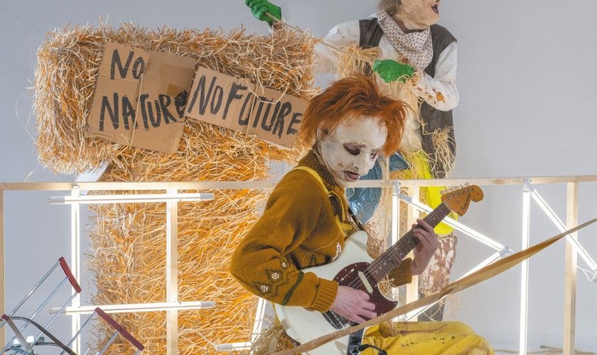 Dans un décor presque aseptisé, nos personnages (épouvantables épouvantails, pas loin d’être des zombies) tentent de reconstruire le monde avec les moyens du bord : plastique, laine, néons, résine…