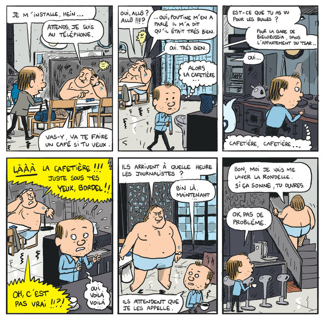 Dans une série de chapitres non dénués d’humour, Mathieu Sapin a croqué Depardieu dans toutes les situations et dans tous ses états. Sur un plateau, autour d’une table, dans son appartement-musée parisien, dans des rencontres diplomatiques, dans un sauna près de Moscou… L’on comprend peu à peu que, derrière la star aux frasques ultra-médiatisées et à l’allure d’ogre, se révèle un homme sensible et intelligent. Son charisme et sa carrière artistique lui ont peu à peu conféré la stature d’un chef d’état (voire plus), ce qui fait que chacune de ses visites dans un pays lui vaut les honneurs nationaux et lui permet de rencontrer les hommes les plus puissants (politiquement et économiquement). Mais Depardieu ne se départit jamais de sa simplicité et de son humour, comme lorsqu’il colle « par surprise » son gros nez sur la joue de Poutine qui reste interdit ! Les épisodes cocasses ne manquent pas dans ce récit à 100 à l’heure !