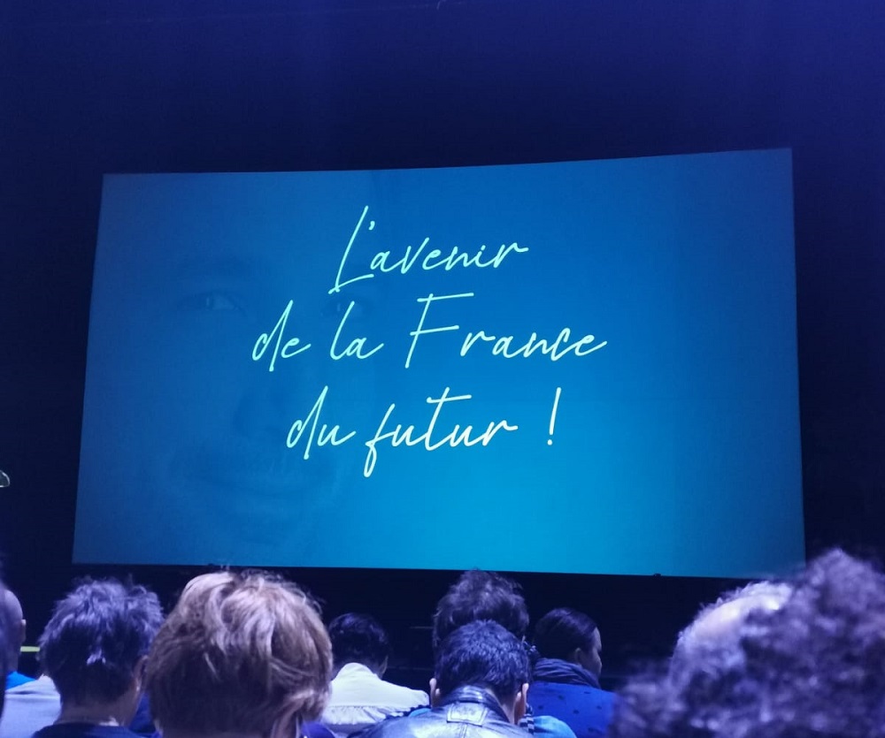 La campagne dont il est question de ce spectacle n’est évidemment pas celle de 2022. Le pauvre Guillaume Meurice n’a recueilli que 6 parrainages, ce qui fait 494 signatures manquantes – mais un score 6 fois supérieur à celui de Florian Philippot, ce qui n’est pas rien ! De toutes façons, il en fallait plus pour décourager l’aspirant candidat. Meurice lance donc avec un peu beaucoup d’avance sa campagne pour la présidentielle suivante, celle de 2027 (qui fait aussi l’objet du dernier roman de Michel Houellebecq).