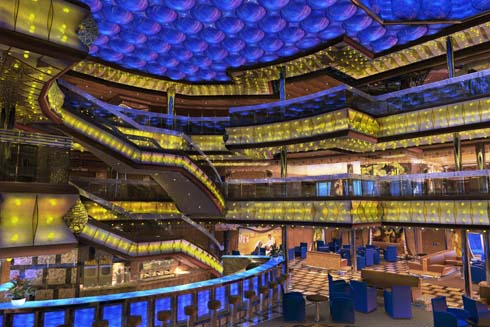 Enfin, on monte à bord… A l’émerveillement et à la frayeur succède le choc ! Oubliez que vous êtes dans un bateau : vous voilà dans le temple du rococo et du tape-à-l’œil dans le pur style de la décoration italienne ! Confusions de matières, de couleurs, de motifs, de lumières… En France, on appellerait ça du mauvais goût ; en Italie, c’est le nec-plus-ultra du design !