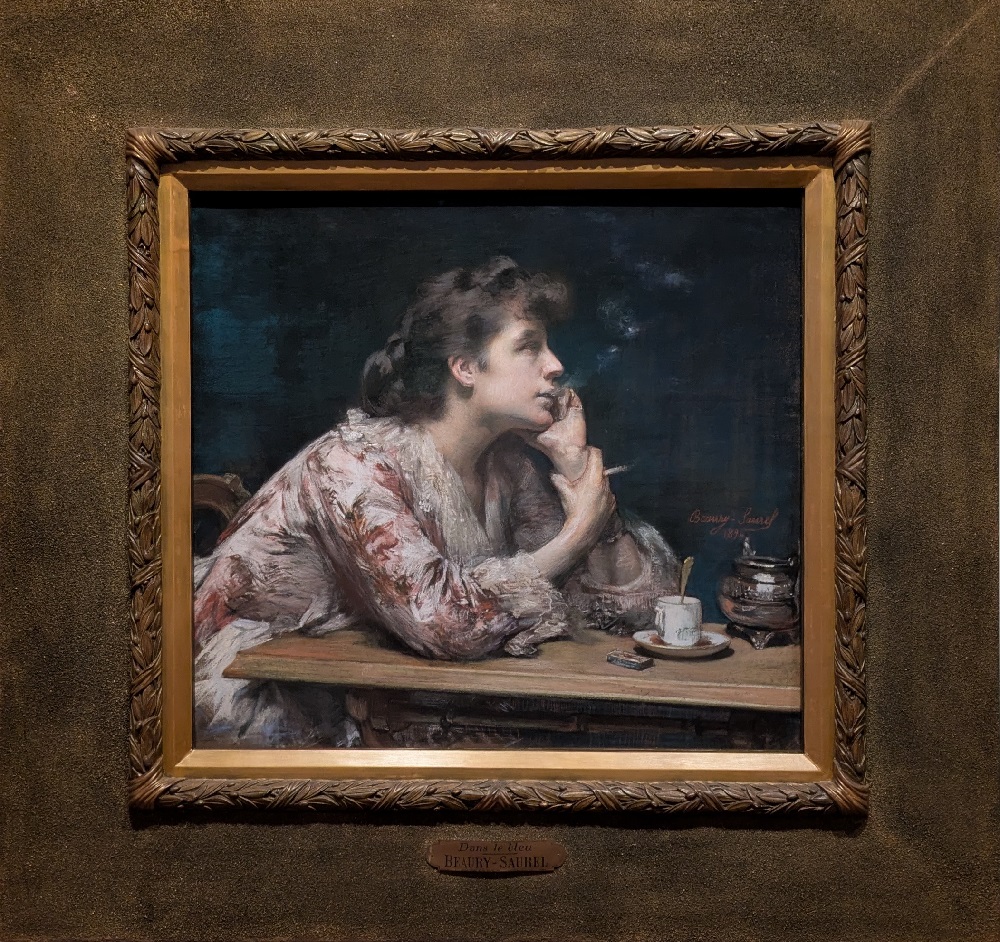 Amélie Beaury-Saurel est l’une des pionnières de la peinture féminine. Elle s’impose ici comme une chroniqueuse engagée de la vie moderne, revendiquant le droit à la solitude oisive et au plaisir du café et de la cigarette pour une femme – l’un comme l’autre étant alors jugés comme inconvenants. Le titre Dans le bleu évoque un état d’âme fugitif, entre symbolisme et réalisme. À la fois moelleuse et indistincte, la technique du pastel contribue au mystère de la scène, possible mise en abîme des pensées de l’artiste.