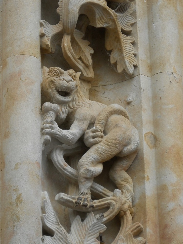 Oui, c’est le genre de détail dont on se souvient 🙂 L’été dernier, j’ai trouvé le même genre de fantaisie dans les ruines d’un temple d’Angkor. Les sculpteurs qui ont pris en charge la restauration ont intégré des dinosaures aux bas-reliefs. Anachronique aussi, mais tout aussi amusant.