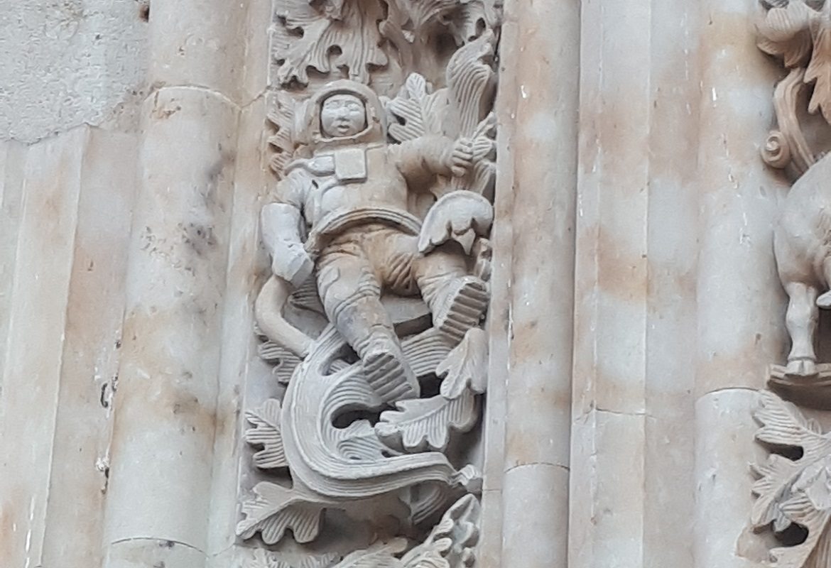 Ne s’agirait-il pas plutôt de la représentation d’une vision qu’aurait eue un personnage mystique de l’église catholique ? De nombreux mystiques ont eu des visions de l’avenir, alors pourquoi pas de la tenue d’un astronaute. Il faudrait fouiller dans les archives de l’église espagnole, et vérifier dans la liste des mystiques, s’il n’y a pas de trace d’un récit du futur. Et ce mystique devait être important et reconnu par l’église pour que sa vision soit sculptée sur la cathédrale de Salamanque.