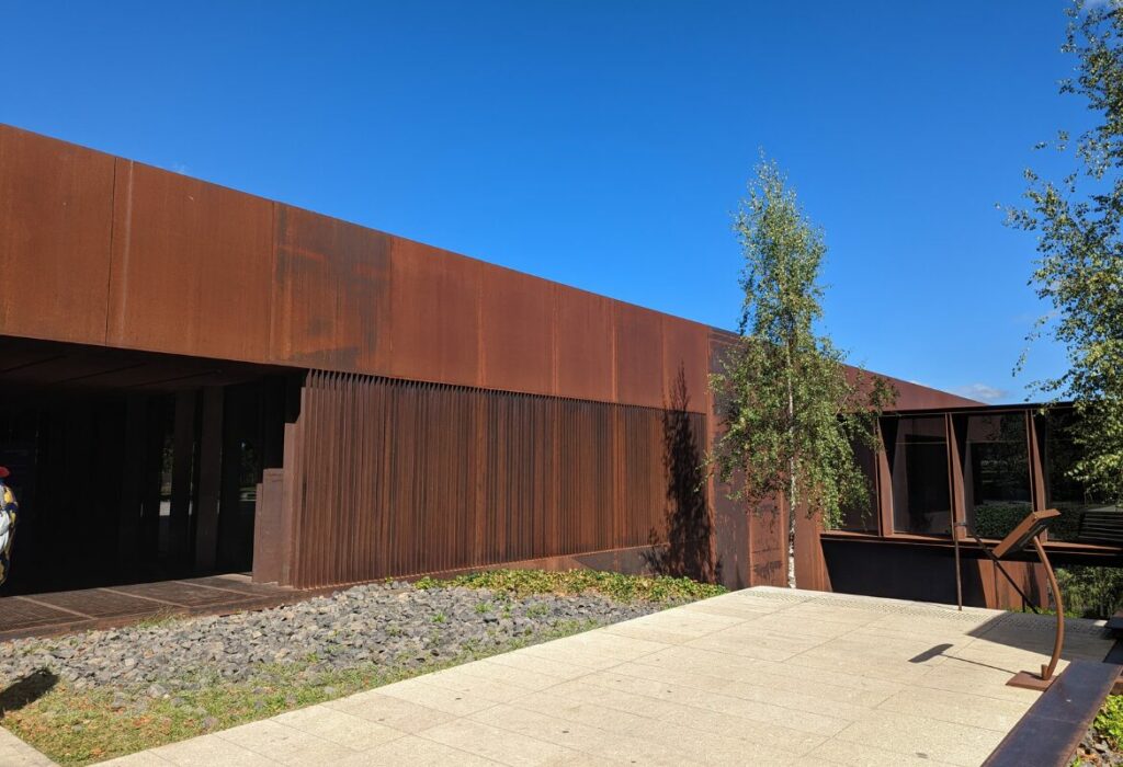 Le choix des matériaux est le véritable trait d’union entre le passé et le présent. L’enveloppe est entièrement vêtue d’acier Corten, un métal dont la corrosion auto-protectrice crée une patine aux teintes changeantes. Ces nuances oxydées ont été choisies pour répondre directement au grès rose et rouge de la cathédrale de Rodez. Cette unité chromatique met en valeur le dialogue fécond entre patrimoine historique et création moderne. Rodez vit au travers de ses monuments.