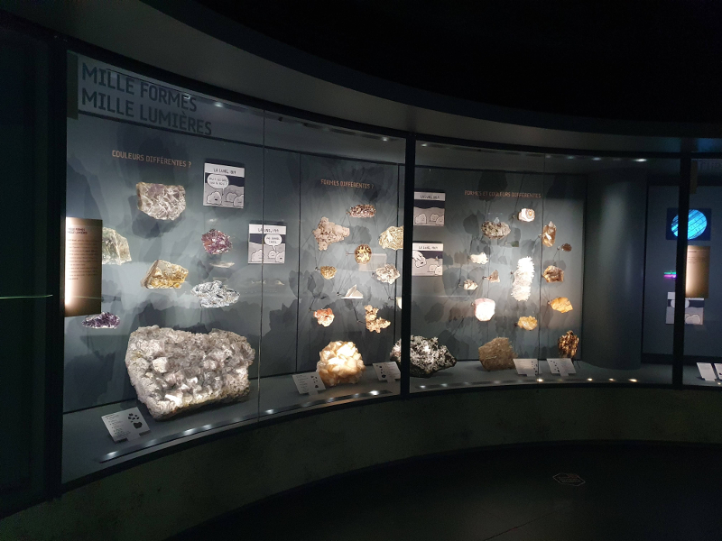 Petit focus sur les pierres. Une vitrine présente des minéraux retrouvés dans une mine de l’Aude, la Salsigne. Une cinquantaine ont été découverts dans ce lieu, mais seulement 39 sont connus : une dizaine sont donc inconnus au bataillon ! La plupart sont contemporains de la formation du gisement mais certains sont nés des transformations liées à l’exploitation de la mine. Le genre d’information que j’ai trouvé absolument passionnante.
