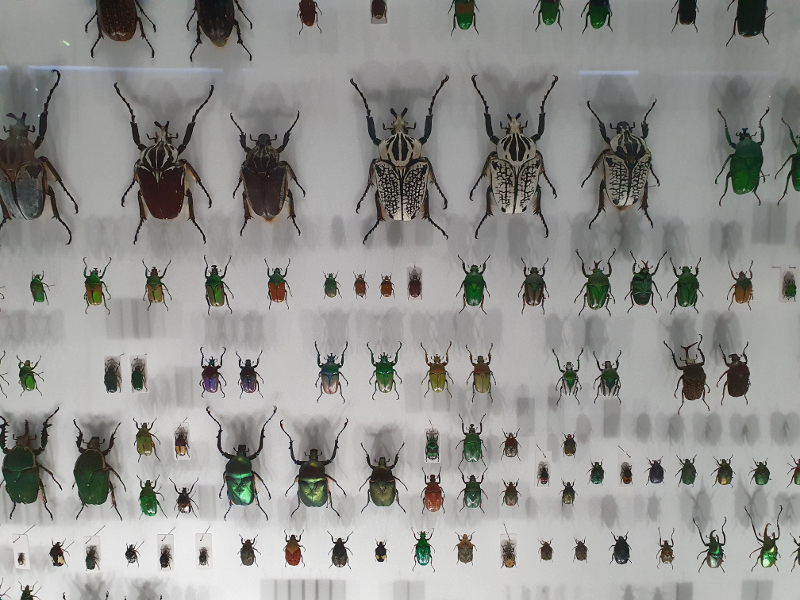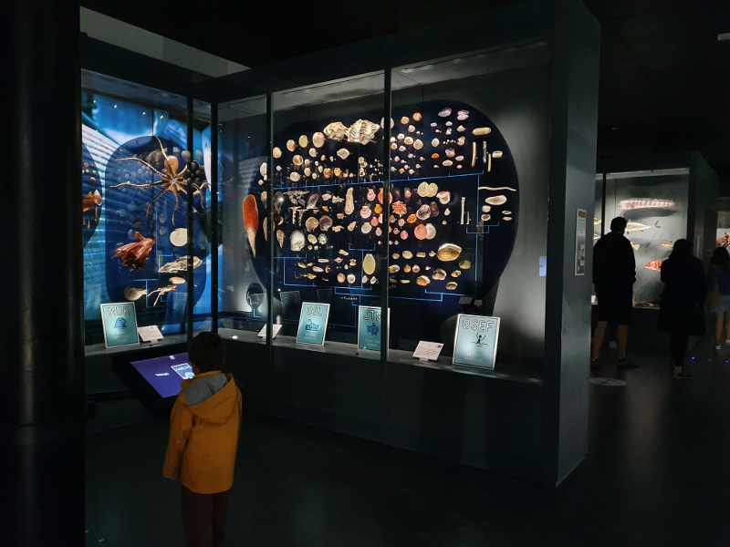 Le début du parcours fait la peur belle aux phénomènes naturels. Gros succès auprès des enfants et nous-même de la collection de géologie, ainsi que des différentes explications autour des tremblements de terre et des volcans. Et on a continué sur la même lancée avec la présentation des collections de zoologie et de botanique. Si ces espaces sont ce qu’on s’attends “classiquement” à retrouver dans un Muséum, ils n’en sont pas moins vraiment très intéressants. C’est vraiment un support à la discussion passionnant avec les enfants, qui ont été chacun super pris par des sujets différents ! Les pierres pour mon grand, les volcans et les coquillages pour mes petits. Quant à moi, vous me mettez devant les collections de scarabée façon cabinet de curiosité et je suis conquise 😉
