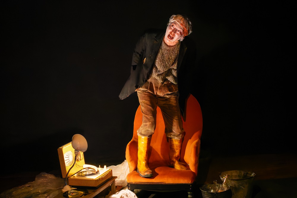 Seul en scène sous la voûte de la Cave Poésie, Régis Goudot offre une performance puissante, habitée jusqu’à l’excès. Le corps vouté, l’œil brillant, la voix râpeuse, il fait exister ce père déchu dans toute sa crudité. Son ombre projetée sur les briquettes de la cave lui donne des airs de vampire. Son maquillage blanc, les tâches de sang qui maculent son visage, l’éclairage en contre-plongée, évoquent un Beetlejuice dérangeant…