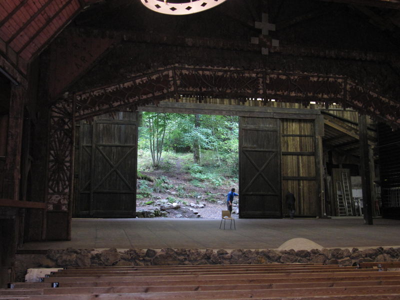 Contrairement au fond de scène des autres théâtres qui donne sur des coulisses ou une arrière-scène, le mur du lointain du Théâtre du Peuple est une immense porte coulissante à quatre battants qui s’ouvre… sur la forêt. Un seul mot d’ordre pour les metteurs en scène qui investissent le lieu : utiliser cette caractéristique dans leur mise en scène.