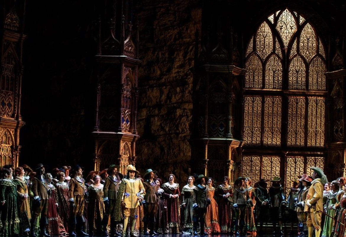 Plutôt que de chercher la relecture conceptuelle, le spectacle revendique un théâtre d’images riche et lisible. Le fond de scène peint — château gothique baigné de clair de lune —, les tours mobiles finement ouvragées dans un esprit troubadour, les costumes d’inspiration Louis XIII et les lumières dorées composent un univers visuel immédiatement évocateur. L’ensemble déploie un romantisme généreux, presque cinématographique, qui sert avec efficacité la dimension mélodramatique de l’ouvrage.