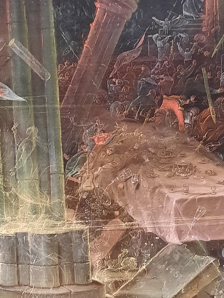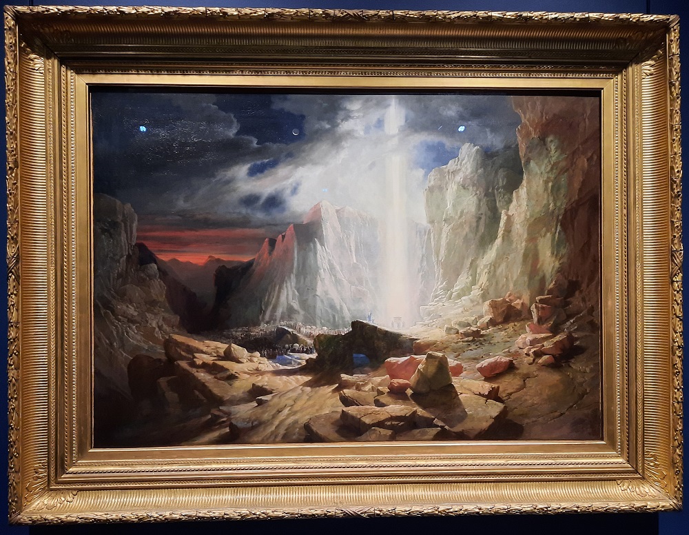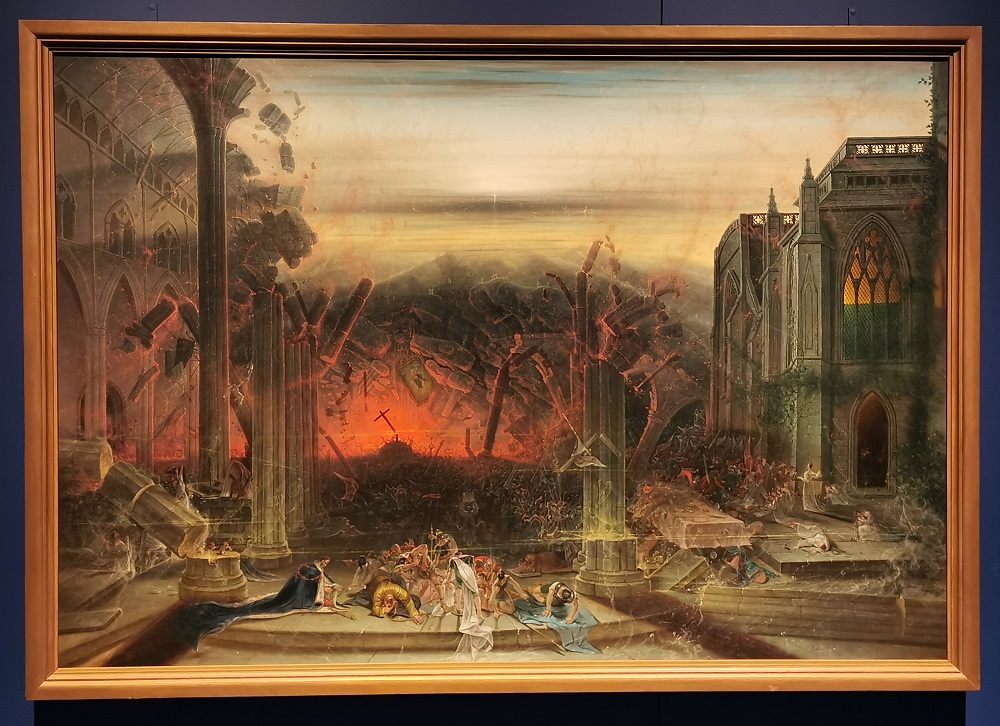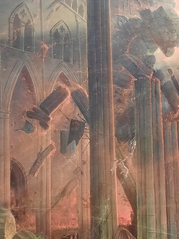 Voilà un grand format digne des meilleurs films catastrophe de nos jours ! Je suis resté très longtemps devant cette toile à regarder tous les détails de la destruction (je vous mets quelques détails en-dessous). Cette allégorie religieuse est très librement inspirée de L’Apocalypse de saint Jean. Samuel Colman représente la colère divine qui s’abat pour détruire une grande église gothique. La peinture est probablement imprégnée des convictions religieuses non conformistes de l’artiste. Elle s’inspire peut-être aussi de l’incendie de Bristol pendant les émeutes de 1831.