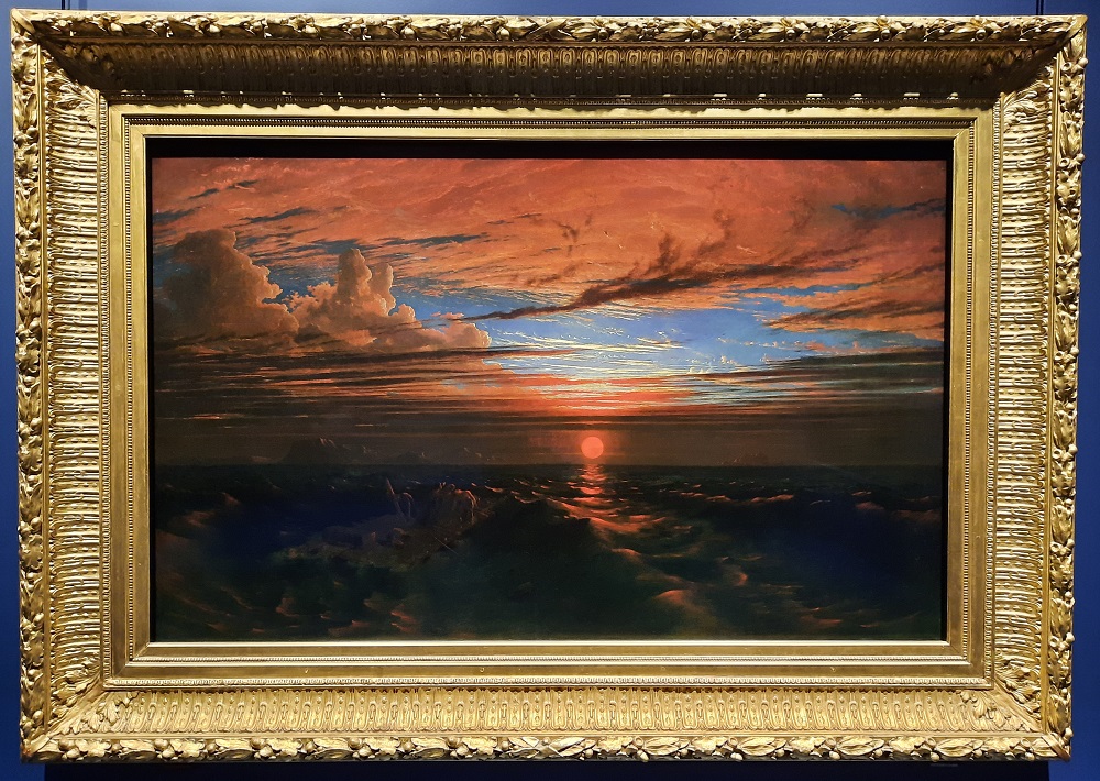 Voilà le tableau que j’ai préféré de cette exposition ! Inspirée du célèbre Radeau de la Méduse de Géricault exposé à Londres en 1820, cette scène maritime représente de malheureux naufragés dérivant sur un radeau après la tempête. Le sujet tragique et les tons rougeoyants du coucher de soleil qui intensifient le drame évoquent les peintures de John Martin. Ce tableau remporta un succès considérable à Bristol puis à Londres.