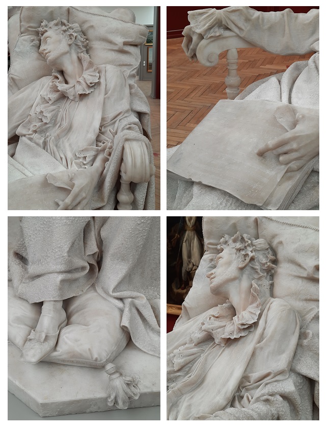 Il n’y a pas que de la peinture au Musée des Beaux-Arts de Bordeaux. On peut aussi y voir quelques magnifiques sculptures. J’adore tout particulièrement celle de Mozart expirant, dont la finesse est remarquable. On devine jusqu’à la maille des bas qui couvent ses pieds, et la dentelle de son col est plus vraie que nature.