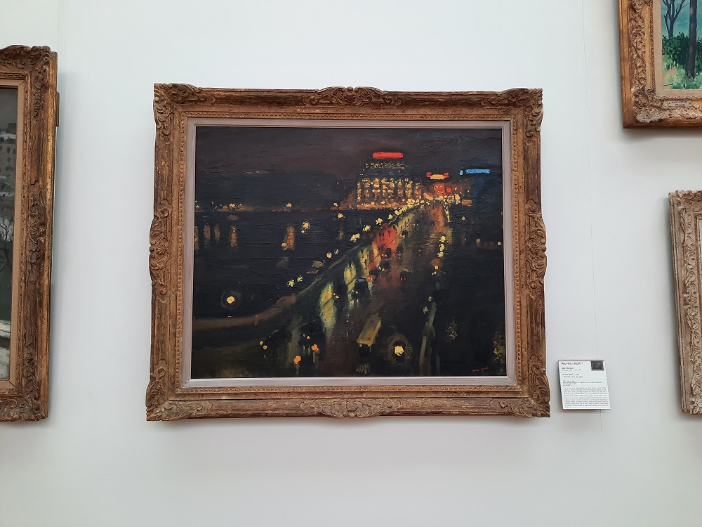 Le peintre a immortalisé le Pont-Neuf de Paris dans des séries puissantes : tantôt sous la neige, tantôt dans la brume. Les paysages nocturnes sont beaucoup plus rares dans sa production. Les lignes de force sont simples : la diagonale nous mène de la Samaritaine illuminée au début du Quai de Conti. Une symphonie de bruns et de noirs est traversée par les illuminations multicolores de l’éclairage artificiel. Les enseignes lumineuses, posées de façon radicale, comme des extraits de couleurs pures, sont une ode au métier du peintre. L’artiste soumet l’ensemble de sa vision du monde aux trois couleurs primaires : le rouge, le jaune et le bleu.