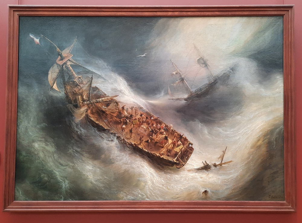 Ce sujet de la mer terrifiante que l’homme affronte dangereusement convient parfaitement à Gudin qui se spécialise dans les représentations des marées fracassantes des orages, des incendies, des naufrages et des paysages marins que Théophile Gautier qualifie de « shakespeariens ». Gudin compose une scène dramatique au cœur d’une gigantesque vague qui entraîne le Colombus, formant la diagonale du tableau tandis que la Julia apparaît à l’arrière-plan. L’artiste reconnaît :