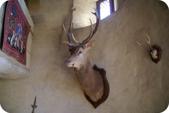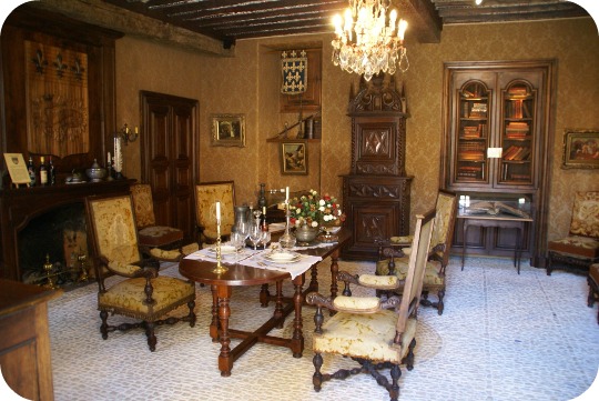 Le manoir est un monument privé, il est quasiment entièrement ouvert au public. Il me semble qu’une partie du dernier étage est encore habité par la famille… sympathique comme petite demeure 😉 On trouve deux bâtiments reliés par une tour hexagonale qui abrite un escalier à vis (un escalier décoré de têtes d’animaux d’ailleurs 😉 ). Les pièces ont été restauré pour créer une atmosphère « dans son jus », on a donc l’impression de visiter un manoir encore un peu habité. Très… pittoresque, comme le reste de Sarlat ! On visite donc en se baladant gentiment de pièces en pièces, tout en rêvant d’avoir un jour un manoir à soi… 15 pièces pour la famille de Gisson, pas mal 😉 On visite donc des salons de réception, des petites pièces de type boudoir, un fumoir… J’ai notamment beaucoup aimé la salle à manger avec son joli sol en pisé. Les boiseries valent le coup d’œil aussi, il y a de jolis plafonds !