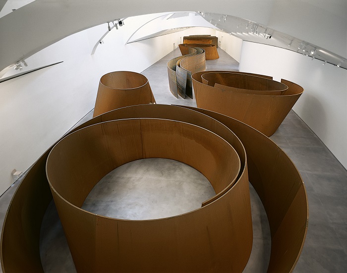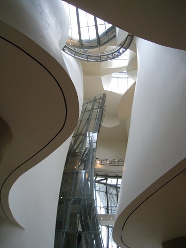 Contrairement à la Fondation Louis Vuitton que l’on doit également à Frank Gehry, le musée Guggenheim n’est pas seulement fascinant de l’extérieur : son hall et la disposition de ses salles d’exposition sont d’une grande originalité. Le cœur du musée se veut puits de lumière, d’où l’on peut contempler les étages supérieurs liés par des passerelles en courbes et un grand ascenseur de verre. C’est à la fois vertigineux, organique et arachnéen !