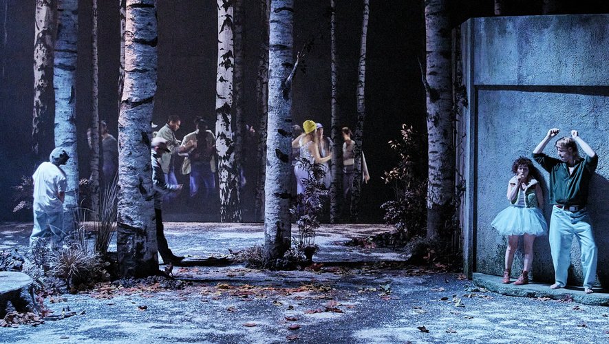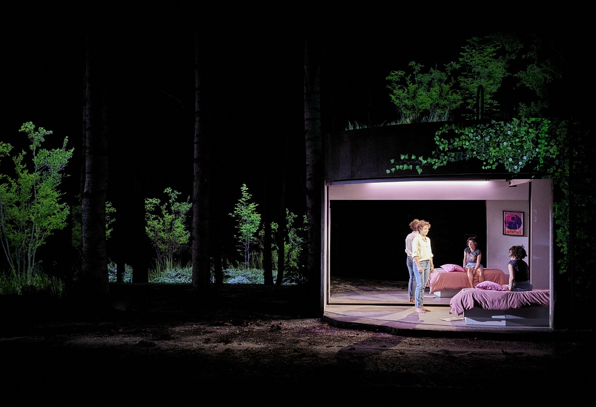 La mise en scène mêle habilement vidéo, musique et jeu d’acteurs sensible, créant un univers onirique sans jamais perdre de vue le réel. Nous sommes dans une forêt de conte de fées (le spectacle a reçu en 2024 le Molière de la création visuelle & sonore) et pourtant le récit est bien ancré dans le monde contemporain : une citerne d’eau, une chambre d’adolescente, un restaurant au sommet d’un building… L’esthétique en clair-obscur, les scènes suspendues dans un décor mouvant, ne sont pas sans évoquer les ambiances feutrées et symboliques de Joël Pommerat.