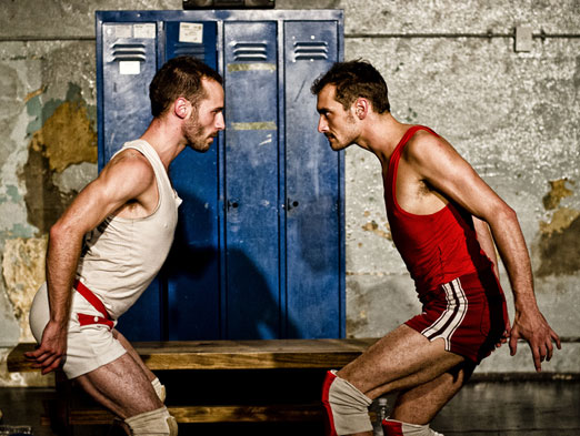 Un Poyo Rojo, ce sont deux athlètes dans les vestiaires d’une salle de sport qui se toisent, rivalisent, jouent les coquelets jusqu’au ridicule. Les habitués des salles de sport reconnaîtront certainement une parodie assez bien sentie de ce que l’on observe souvent dans les vestiaires de la part de mâles gonflés à la testostérone. Mais que cache un tel culte du corps et cette obsession de la comparaison ? N’y aurait-il pas un fond de séduction et de désir sous cette apparente arrogance ?