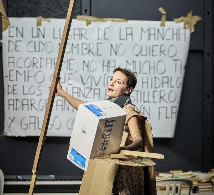 Bien que le titre de la pièce mette l’accent sur le fameux hidalgo de la Manche, le narrateur prend dans ce spectacle autant de place que le personnage. Si vous avez lu le roman de Cervantès, vous savez que cela fait partie de son style. Marie-Noëlle donne corps à cette voix narratrice avec beaucoup de talent.