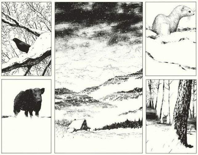 Les anecdotes qui jalonnent ce récit lacunaire nous éclairent peu à peu. On oscille sans cesse entre les aspects trop ordinaires d’une vie de village, et l’horreur dans son expression la plus crue. L’ambiance de ce deuxième volume est sombre et glaciale, ce que reflètent bien les dessins en noir et blanc de Manu Larcenet. Sur de grandes pages sans bulle, les paysages s’étalent à n’en plus finir et nous absorbent par leur beauté.