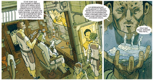 Le scénario ne manque pas de profondeur, même si on éprouve une petite sensation de déjà-vu. Outre l’enquête menée par Scott autour du projet démiurgique de Tianzhu, l’histoire permet de faire une critique à peine voilée de la société de consommation dans laquelle nous vivons, sa violence et les manipulations auxquelles nous soumettent les multinationales grâce aux nouvelles technologies qui envahissent nos espaces visuels mais également mentaux. Difficile de ne pas voir derrière Tianzhu une caricature cinglante d’Apple et de Google et leur politique à la big brother à laquelle nous ne parvenons pas à résister.