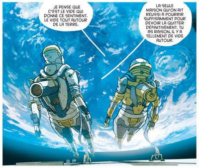 Les images sont parfois étourdissantes, notamment celles qui représentent des scènes spatiales avec de magnifiques contrastes. On sent la solitude du héros quand les pages entièrement noircies nous font entendre le silence de l’univers. La couverture de la BD à elle seule donne le ton !