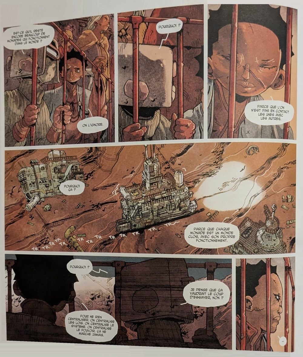 L’histoire se déroule principalement à bord du Cherche-Midi, où cohabite une petite communauté d’une quarantaine de personnes. Dans cet univers hostile, la survie impose une organisation collective rigoureuse : chacun a sa fonction, chacun participe à maintenir la monade en marche. La vie à bord est faite de bruit de moteurs, d’huile, de rouille et de réparations incessantes. Mais elle est aussi faite de solidarité. Dans ce monde en ruines, c’est le groupe qui permet de tenir, et le mouvement permanent qui garantit une forme de liberté.