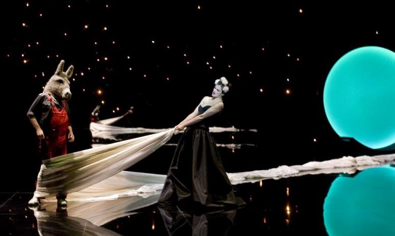 La mise en scène du Songe par Laurent Pelly est à la fois très sombre et très visuelle. En effet, la scène est constamment baignée dans l’obscurité de la nuit et les éclairages proviennent d’une multitude de petites ampoules suspendues qui figurent les étoiles et la lune. Les personnages mortels jouent en pyjama et ne se départissent jamais de leurs oreillers, tandis que les personnages féeriques sont vêtus de costumes somptueux et hissés par des treuils qui donnent l’impression qu’ils volent ou flottent dans les airs. Tout participe à recréer l’atmosphère étrange et merveilleuse d’un rêve !