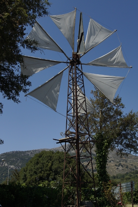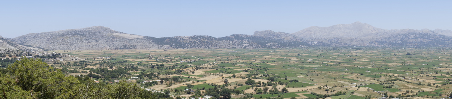 Le plateau de Lassithi est une enclave à part dans le massif de montagnes calcaire, une vaste plaine agricole. Après avoir grimpé à flanc de montagne dans un paysage assez sec et très bruyant (non mais sérieux, les cigales, c’est infernal !!!) nous avons eu un petit choc en passant le col. D’un paysage montagnard très sec écrasé de chaleur, on se retrouve d’un coup face à une plaine fertile. Les terres cultivées forment comme un damier, un très beau paysage quand on arrive depuis la route. Surnommée « la plaine des moulins à vent », elle abrite en effet de nombreux moulins aujourd’hui généralement à l’abandon.
