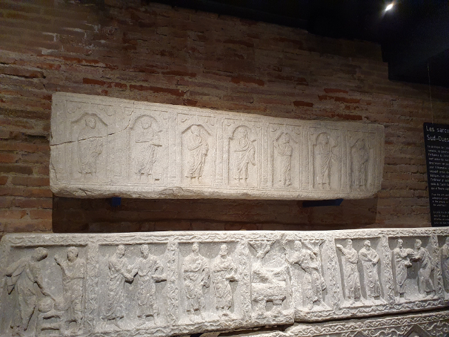 On finit la visite en frissonnant… Le sous-sol du musée est au niveau de l’une des nécropoles de la ville, qui s’était considérablement développée après l’inhumation au IIIème siècle de saint Saturnin. La collection de sarcophages paléochrétien du musée a ainsi un écrin à sa hauteur, ou plutôt sa profondeur. C’est vraiment un espace particulièrement intéressant si vous aimez la sculpture antique, car ces sarcophages sont de véritables chefs-d’œuvre. On retrouve également à ce niveau des inscriptions funéraires latines sur plaques de marbre.
