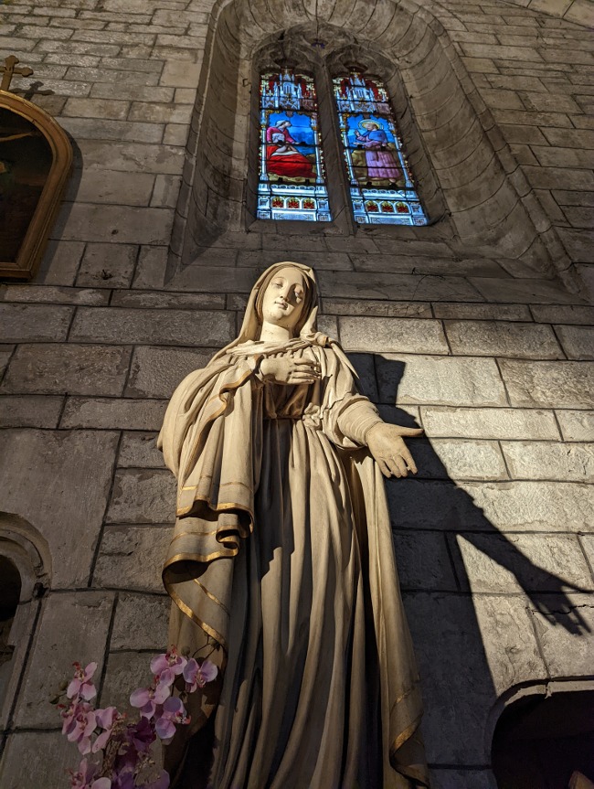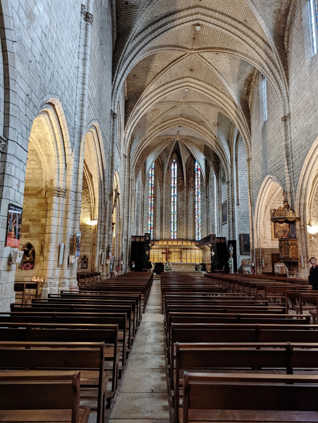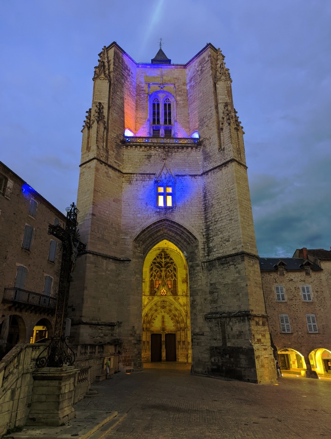 Surtout, Villefranche-de-Rouergue est riche d’un patrimoine religieux vraiment abondant. La collégiale Notre-Dame marque de son empreinte la place éponyme. Nous avons pu la voir de nuit, et avec l’éclairage l’atmosphère était vraiment particulière. L’impression d’être dans un roman de cape et d’épée un peu ! Il s’agit d’une église de style gothique méridional, à la nef unique et aux puissants contreforts. Nous avons fait un tour dans l’ancienne petite chapelle Saint-Jacques, qui accueille désormais une exposition permanente sur les chemins de Saint-Jacques-de-Compostelle.