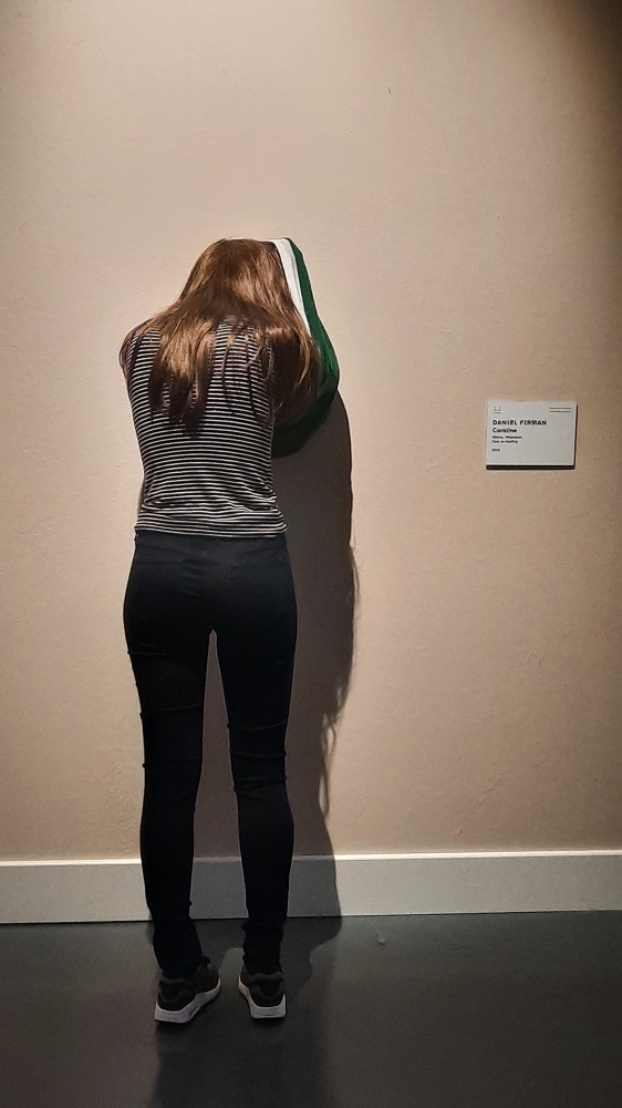La statue de Caroline, signée Daniel Firman, nous a tout de suite interpelée. Dans le premier hall, Caroline semble regarder derrière la cloison. Je dois vous avouer que l’illusion est parfaite : nous pensions qu’il s’agissait d’une vraie jeune fille qui regardait une œuvre située derrière un trou dans le mur. Nous avons donc attendu notre tour, mais la jeune fille n’a pas bougé… Il nous a presque fallu une minute pour comprendre qu’il ne s’agissait pas d’une visiteuse mais bien de l’œuvre elle-même, une statue hyperréaliste ! Le ton était donné !